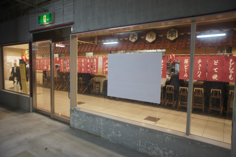 目の前の居酒屋?おでん屋さんは日本一カウンターが長い飲食店として頻繁にTV取材を受けている超有名店です。土日平日問わず連日満員の大盛況で疲れたサラリーマンのオアシスという表現がピッタリですね。(大体15時位から客が入りだします。中々迫力ある光景ですよ♪)
